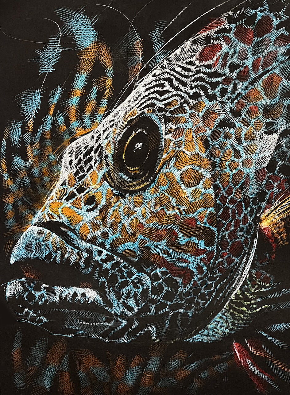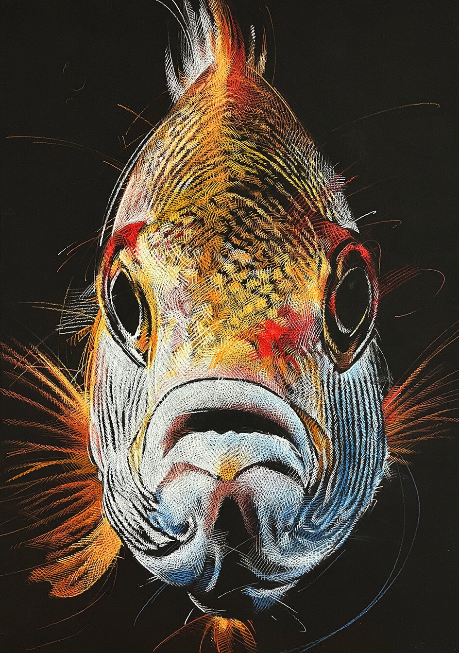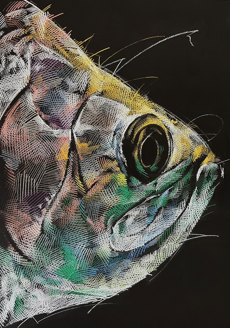 Alle Fische sind im Format 45 x 67.5 cm / Buntstift auf schwarzen Holzplatten / lackiert / Hängevorrichtung