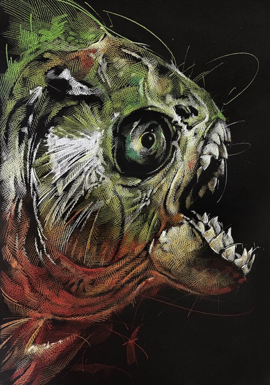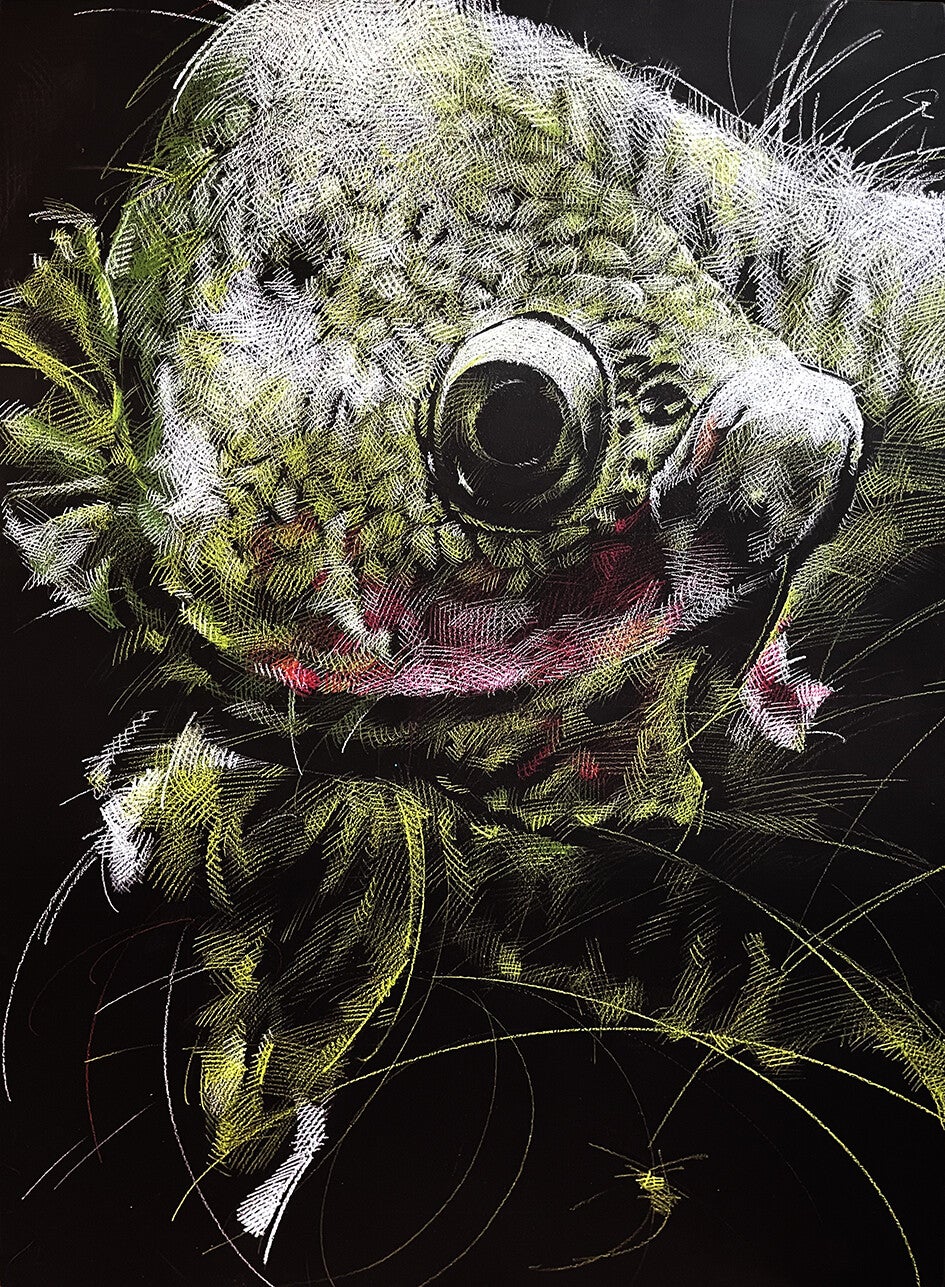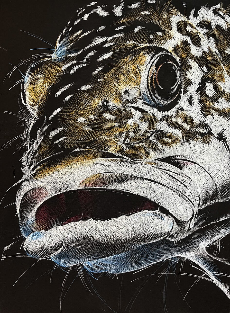 Alle Fische sind im Format 45 x 67.5 cm / Buntstift auf schwarzen Holzplatten / lackiert / Hängevorrichtung